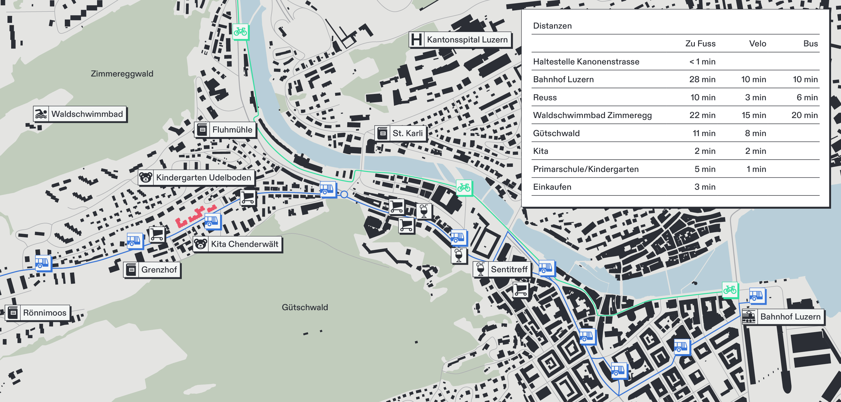 Die Genossenschaftssiedlung ist zentral gelegen – mit dem Velo oder Bus Nr. 12 ist der Bahnhof Luzern in 10 Minuten erreichbar.